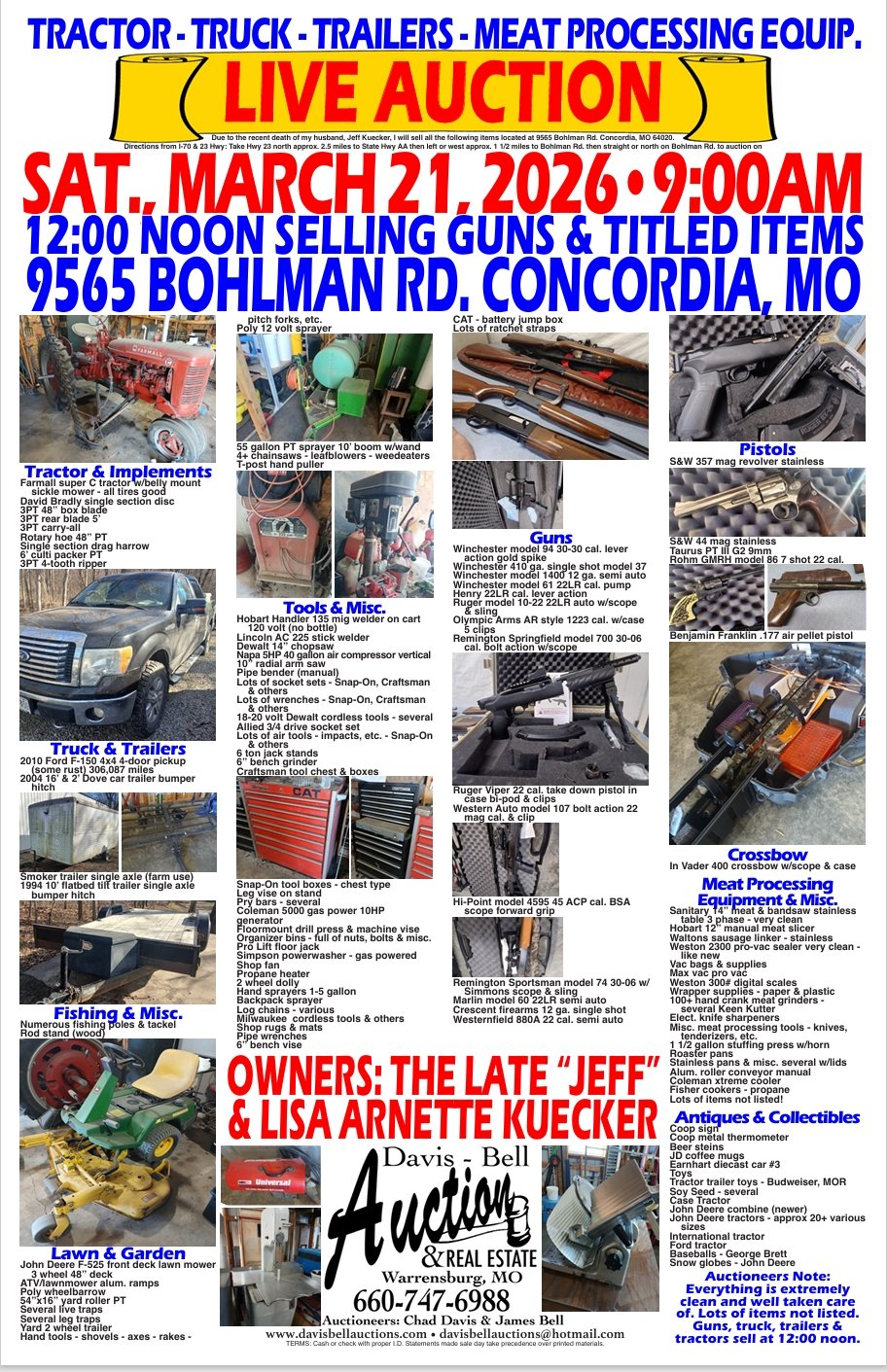 Due to the recent death of my husband, Jeff Kuecker, I will sell all the following items located at 9565 Bohlman Rd. Concordia, MO 64020.